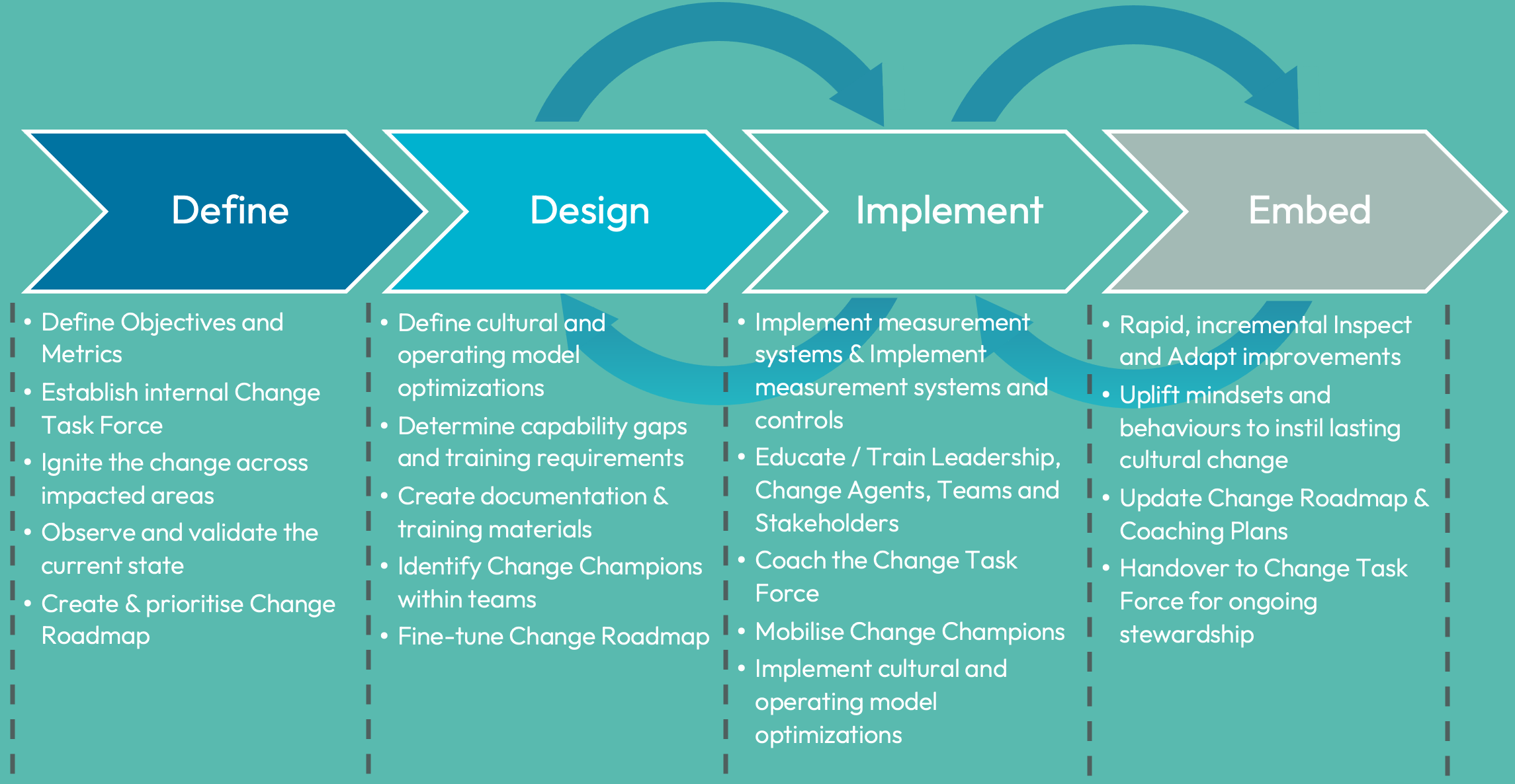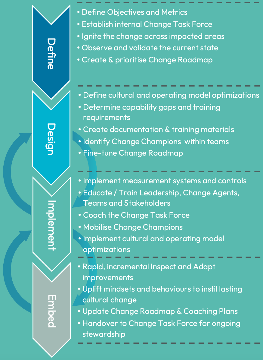 Our 4-step service model embodies an iterative & incremental approach to transformational change, which provides transparency, traceability and data-driven results.